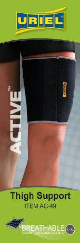 Uriel Active Thigh Sleeve reduces hamstring and quadriceps pain and strains, facilitating healing and a more rapid return to normal activities. Quality Neoprene Material covered with Lycra fabric on both sides and breathable air mesh elastic for comfortable all-day wear. Ultimate compression and support for painful hamstring strains, hamstring injuries, pulled hamstrings, quadriceps pulls, quadriceps tears and pulled groin muscles.