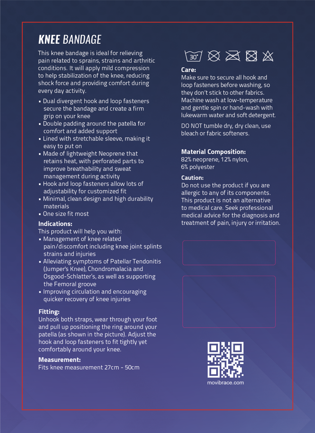 The Mövibrace Dynamic Knee Bandage applies compression and stabilization to knee area, including the knee cap and surrounding joint to address knee strains and injuries including Jumper's Knee and Chondromalacia, The Dynamic series is especially for athletes who need premium comfort, airflow and moisture-wicking properties to heal and prevent re-injury.